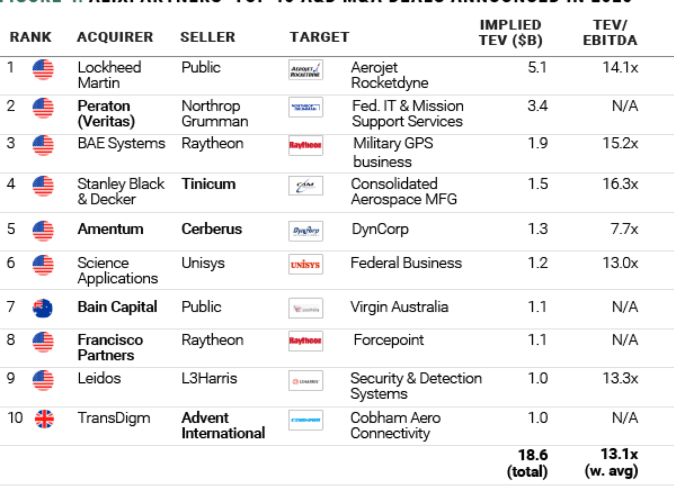 Si l’on passe au crible les principaux acteurs des opérations de 2020, il est intéressant de remarquer en premier lieu la place toujours majeure des acteurs du Private Equity, impliqués dans 6 des 10 plus grandes transactions de l’année. Par ailleurs, les acteurs qui ont connu le plus rapide redressement de leur activité M&A ont été les entreprises les plus exposées à la commande publique – et donc les moins sensibles au contexte économique –, défense en tête. Et elles ont également représenté la plupart des grandes opérations. Ainsi, la plus grosse transaction a été l’acquisition d’Aerojet Rocketdyne (moteurs de fusées et missiles) par Lockheed Martin pour 5,1 milliards de dollars. Et pour 5 des 6 plus grandes opérations de 2020, la cible acquise était liée à des activités gouvernementales ou de défense.